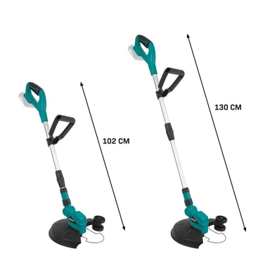 Denna trimmer har en dubbellinsspole på totalt 8 meter (2x4 m) och ett smidigt "tap & go"-system – slå trimmerhuvudet lätt mot marken så justeras linan automatiskt till rätt längd. Med en klippdiameter på 25 cm arbetar du effektivt även i större områden. Det justerbara aluminiumhandtaget (42–70 cm) gör att du kan arbeta ergonomiskt oavsett kroppslängd.