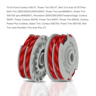 Ersättningsspole med trimmertråd som passar för följande grästrimmer: Flymo Contour 500 XT, Power Trim 500 XT, Mini Trim Auto ST/XT/Plus Multi Trim 250D/250DX/300D/300DX, Power Trim (pnc9648641), Power Trim 500/700 (pnc 2/0705 Revolution 96085), /2300/2500/Twistand Edge, Contour 500XT, Power Contour 600HD, Power Trim 500XT, Power Trim 600HD, Contour Power Plus Cordless, Sabre Trim, Contour 500/700, Power Trim 500/700, Mini Trim Auto Plus/Mini Trim Plus XT.