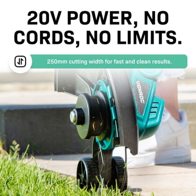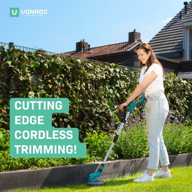 Vill du underhålla och vårda din gräsmatta på plaster där din gräsklippare inte når? Används då VONROC’s 20V batteridrivna grästrimmer. Den stora och främsta fördelen med en batteridriven grästrimmer är att du inte längre behöver bekymra dig om och kämpa med förlänings- och skarvsladdar: se bara till att batteriet är laddat och du kan direkt komma igång med jobbet. Denna kanttrimmer har en stor skär-/ trimningsdiameter på 250mm och är utrustad med en dubbel spole på inte mindre än 8 meter (2 x 4m)