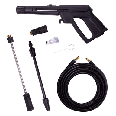 Den här högtryckstvätten levereras med en sprutpistol, ett justerbart munstycke, en turbolans, en övergångsadapter, en trädgårdsslangsanslutning med vattenfilter och en rengöringsnål. Tack vare den integrerade tvättmedelsbehållaren och andra tillbehör så är högtryckstvätten lämplig för en mängd olika arbeten, till exempel: