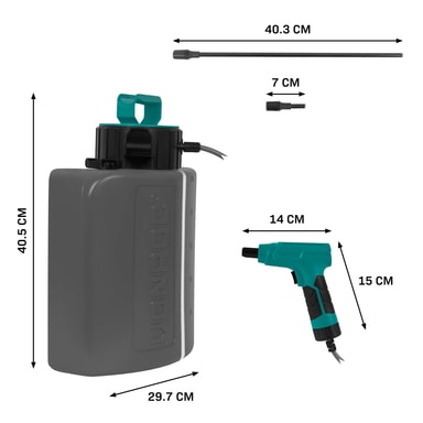 Behållaren rymmer hela 10 liter och är utrustad med en praktisk nivåindikator. Tack vare de breda bärremmarna kan du bekvämt bära sprutan på ryggen som en ryggsäck, medan den 1,5 meter långa slangen ger dig stor rörelsefrihet. Både en kort och en lång sprutlans ingår, så du alltid har rätt tillbehör till hands. Varje lans har ett justerbart munstycke, vilket gör att du enkelt kan växla mellan en kraftig stråle eller en fin dimma. Detta gör trycksprutan mångsidig och användbar för en rad olika uppgifter. Efter användning laddar du enkelt upp batteriet igen med den medföljande USB-C-kabeln.