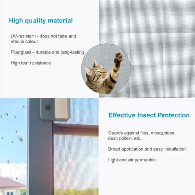 Vårt flamskyddade flugnät av högkvalitativ glasfiber ger dig - jämfört med andra material - en långvarig användning på dina dörrar och fönster. Tack vare den UV-beständiga glasfibern bleknar nätet inte och behåller sin rivstyrka. Den höga rivhållfastheten förhindrar också att nätets ändar slits sönder. Det skyddande nätet håller insekter och annan miljöpåverkan som pollen och damm ute. Beroende på omständigheterna kan det fästas med klämma, kardborreband, självhäftande remsor eller dubbelhäftande tejp. Denna produkt säljs per meter, dvs. 1 order = 1 meter. Maskstorlek 1,2 mm.