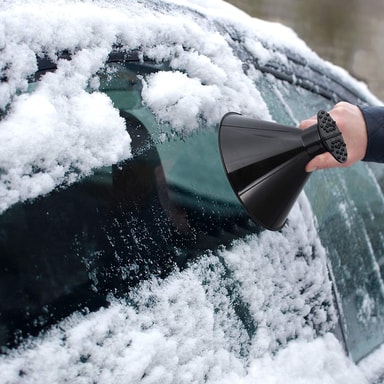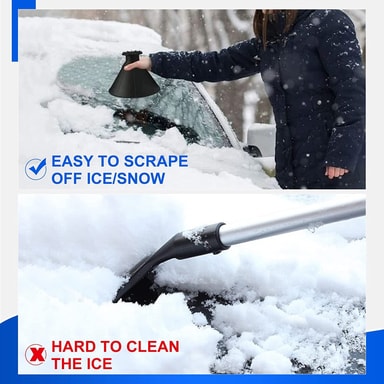 Snö- och isskrapa genialiskt designad för is- och snöborttagning. Extra bred sida för att täcka ett större område och snabbt ta bort snö, den andra sidan är avsedd för isborttagning och repar inte bilrutan.