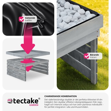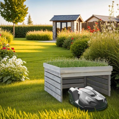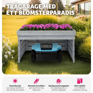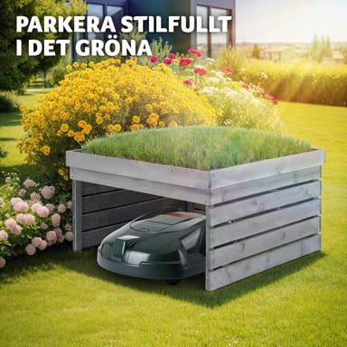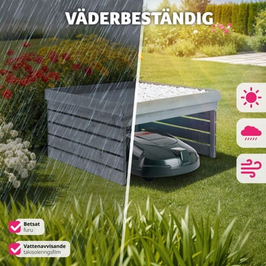 Den väderbeständiga ramen är tillverkad av hållbara och betsade tallträslister och kan användas universellt för många robotmodeller. Det ger din självgående gräsklippare ett säkert tak och skyddar pålitligt mot regn,hagel och solljus.