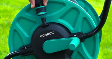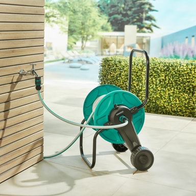 - Slangvagn med 20 meter trädgårdsslang: Trädgårdsslangen är smidig att dra ut och on tack vare veven på sidan av slangvagnen. Den är även lätt att lyfta och bära tack vare sin kompakta design och bärhandtag.