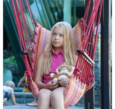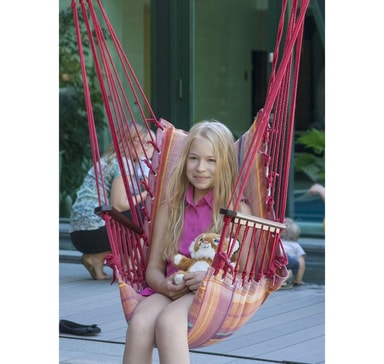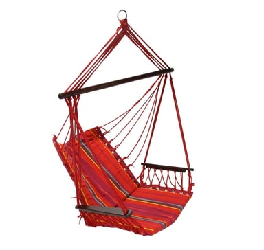 Gungstol HIP, röd. Sitsen på hängstolen är gjord av bomullstyg. Det finns 4 cm skumstoppning inuti sitsen och ryggstödet. Sitsens bredd är 48cm, djupet är 45cm, höjden på ryggstödet är 55cm. Längden på armstödet i trä är 39 cm, längden på hängpinnen i trä är 80 cm. Max lastkapacitet 120 kg. Hängstolen kan hängas på en kraftig trädgren eller balk. Det går även att använda ett speciellt stativ för att hänga upp gungan. SKÖTSEL: för att förlänga produktens livslängd, skydda den från väder och vind. Lämna inte gungan i sol eller regn under en längre tid. Tygets och sladdarnas hållbarhet minskar på grund av UV-strålning och överdriven fukt, och färgerna bleknar. Ta om möjligt ner gungan efter användning och förvara den i ett torrt, välventilerat rum. Låt gungan torka helt innan du förvarar den. Handtvätt tillåts i vatten upp till 40 grader. Använd endast milda rengöringsmedel.