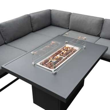 Centralt i detta exceptionella set är det genialiskt designade eldstadsbordet, som lägger till ett fängslande element till din utomhusupplevelse. Inbäddad sömlöst i bordets yta och fylld med naturliga vulkaniska stenar, blir eldstaden fokuspunkten, som ger ett varmt och inbjudande sken som förvandlar ditt utomhusutrymme till en mysig oas.