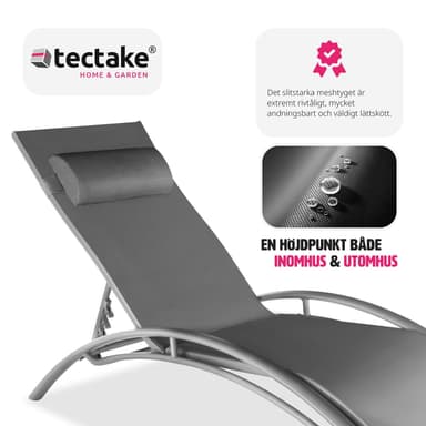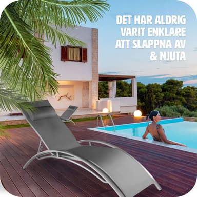 Våra solsängar är tillverkade av robust aluminium och slitstarkt Textilene-tyg, vilket garanterar långvarig användning och resistens mot väderförhållanden. De är både väderbeständiga och UV-beständiga, vilket gör dem perfekta för utomhusanvändning. Med golvskyddande plastkapslar skyddar dessa solsängar även ditt underlag från skador.