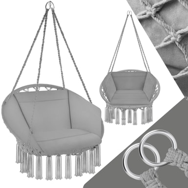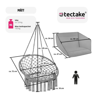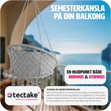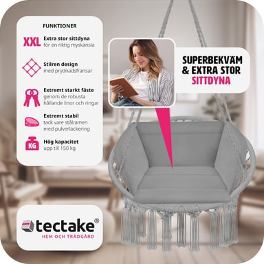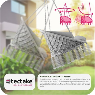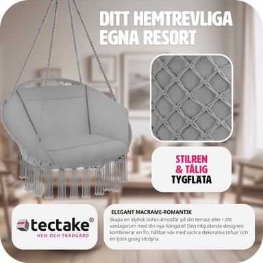 Sväva lugnt ovanför all vardagsstress i denna eleganta och bekväma hängstol och hänggunga från tectake. Den supermjuka dynan och det fina flätade bomullsmaterialet med dekorativa prydnadstofsar anpassar sig perfekt efter din kropp och säkerställer att du sitter bekvämt i hängstolen. Trots den låga vikten är konstruktionen av pulverlackerat stål, polyester och bomull ytterst stabil och robust. När denna hängstol inte används kan den enkelt plockas undan och lätt tas med överallt. Njut av en spännande bok eller ett glas gott vin i vår hängstol.