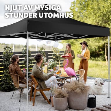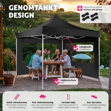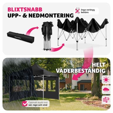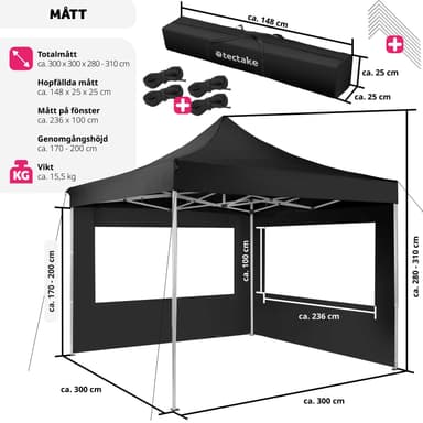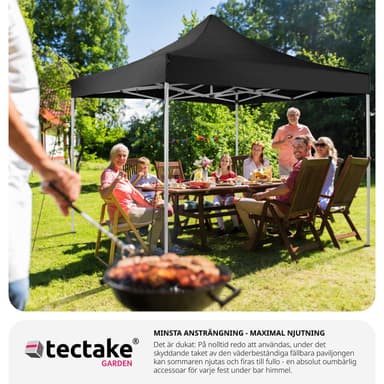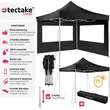 Stäng ute sol och regn med detta funktionella och hopfällbara partytält från tectake. Med några få handgrepp är paviljongen redo att användas, tack vare det enkla saxstativet med klicksystem. Krokar och kardborreband håller ihop taket och sidodelarna med paviljongens robusta ställning. Höjden på den rostfria ramen och vattentäta paviljongen kan varieras efter behov. För bekväm transport och för att ta lite plats vid förvaring kan det hopfällbara partytältet plockas undan kompakt i den medföljande väskan. Mångsidig, flexibel, anpassningsbar: Det är ledorden för denna praktiska och hopfällbara paviljong från tectake.