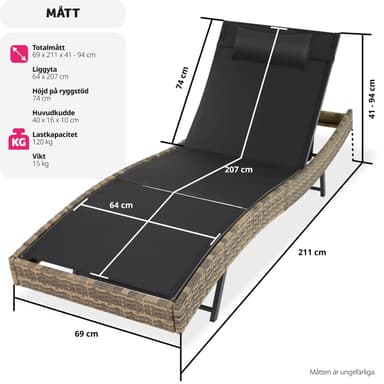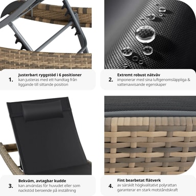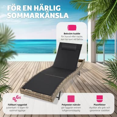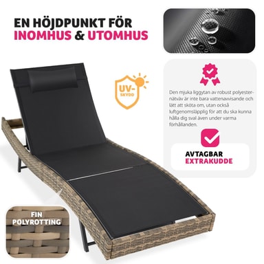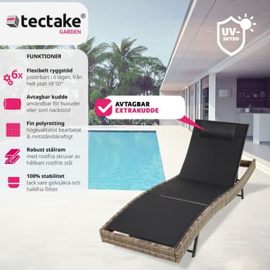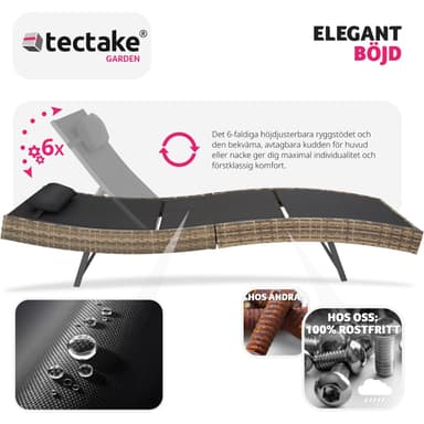 Njut av de soliga dagarna på ett avkopplande sätt med den mysiga solstolen Moana från tectake. Det 6-vägs justerbara ryggstödet, det svala meshtyget och den mjuka kudden garanterar maximal komfort. Det fina flätade mönstret och den svängda formen ger den inbjudande trädgårdsstolen dess speciella utstrålning. Vid användning ger de flexibla utemöblerna dig avslappning med lågt underhåll, hög stabilitet och golvvänliga plastkåpor - den bekväma solstolen från tectake: din semester börjar här!