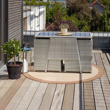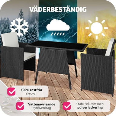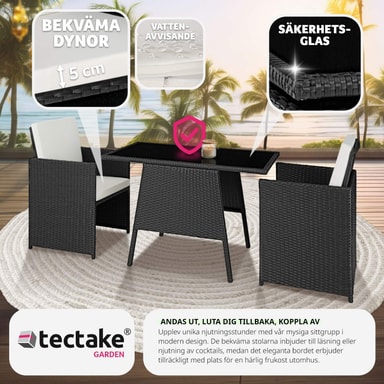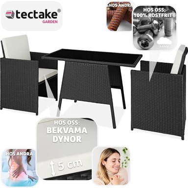 Denna kompakta sittgrupp i konstrotting från tectake är liten och nätt. Möblerna är funktionellt konstruerade, men utan att göra avkall på bekvämlighet och en tilltalande design. Det flätade kvalitetsmaterialet polyrotting uppvisar ett smakfullt mönster. Ramen består av robust, pulverlackerat stål. Utmärkt på små balkonger och terrasser: De separata elementen kan praktiskt skjutas ihop. Fåtöljerna är ytterst bekväma och de mjuka dynorna är dessutom löstagbara och lätta att rengöra. Helt enkelt perfekt för lite tid på tu man hand: Vår mysiga sittgrupp Lausanne från tectake.