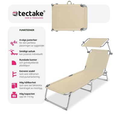 Högkvalitativ solsäng med soltak från tectake. Den ideala följeslagaren för att kunna koppla av och njuta på fritiden och semestern. Dessa solsängar är som gjorda för att placeras på stranden eller i trädgården. Köp denna solsäng från tectake och kom ut och njut solen utomhus.