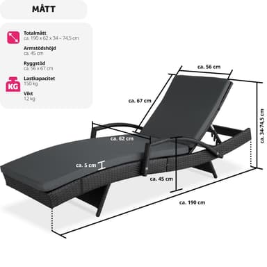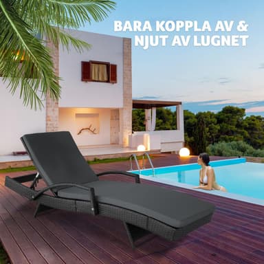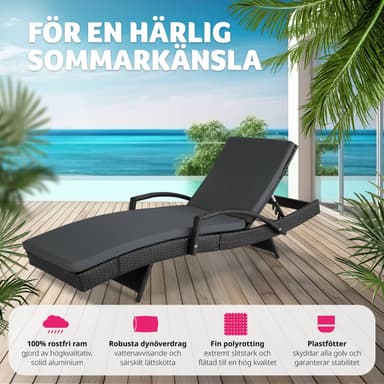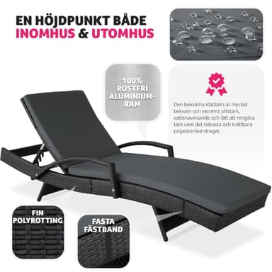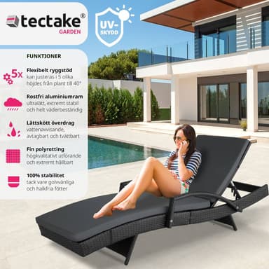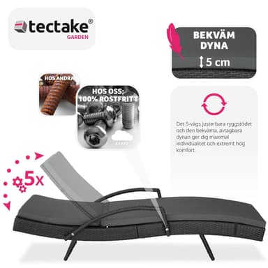 Med denna funktionella solsäng i konstrotting och robust aluminium, kan du alltid ligga bekvämt och njuta av sommaren utomhus. Solsängens stilrena och moderna konstruktion utmärker sig genom sin design och hög komfort med sina dynor. Solbäddens ryggstöd kan justeras i fem lägen, med den mjuka dynan och de praktiska armstöden hittar du alltid det bästa läget för avslappning. Det slitstarka flätade materialet av konstrotting och den stabila ramen av aluminium gör denna solsäng perfekt som utemöbel. Solbädden är lätt och rostfri och lämpar sig för utomhusbruk. Den följsamma solsängen från Tectake anpassar sig perfekt efter dig.