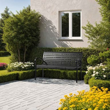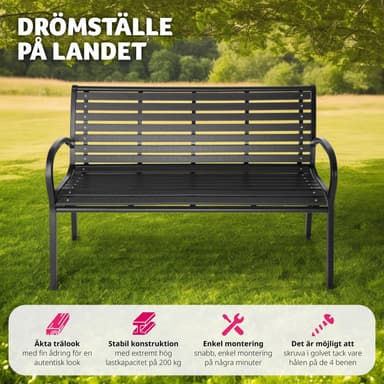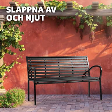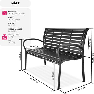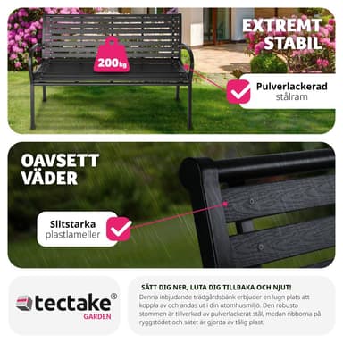 Den inbjudande trädgårdsbänken från tectake med välvda armstöd skapar en trivsam känsla på din uteplats. Sittbänken är beräknad till tre personer med god plats mellan varandra. Bänkens stabila stålstativ med skyddslack, samt motståndskraftiga lameller av plast, garanterar hållbarhet och god livslängd. Sittbänken är enkel att montera och är lättskött, den kan enkelt hållas ren med en fuktig trasa.