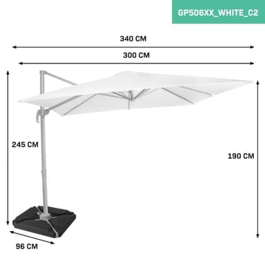 Premium cantilever parasoll Pisogne har en skärm på 300x300 cm, vilket ger en mycket stor yta i skuggan. Den fribärande konstruktionen lämnar stången i mitten, detta gör att du kan arrangera din uteplats precis som du vill! Uppsättning och fällning görs enkelt tack vare ett smidigt vevhandtag. Parasollet är 360° roterbart och helt vinklingsbart, justera till önskat läge med hjälp av fotpedalen och vridknappen. Följ bara solen och sikta på den bästa platsen utan att behöva flytta hela parasollet!