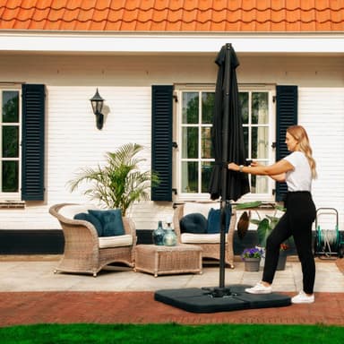 Med denna uppsättning av 4 parasollplattor/basvikter kommer ditt parasoll att hållas stadigt på plats. Plattorna rymmer 15 liter vardera och kan enkelt fyllas med vatten, sand eller cement. När de är fyllda kan plattorna ge en totalvikt på ±100 kg! Plattorna är lätta att tömma (om de är fyllda med vatten) och när de är tömda är de lätta och enkla att flytta/förvara.