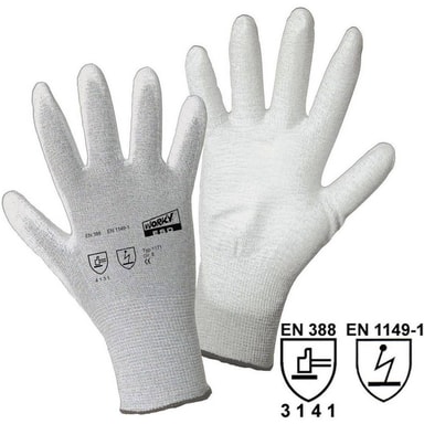 Nylon Arbetshandske Storlek (handskar): 7, S EN 388, EN 1149-1 CAT II L+D worky ESD Nylon/Carbon-PU 1171-7 1 stFrån en kombination av nylon med kolfiber · Seamless · Med vit PU-beläggning på handflatan · Andningsbar handrygg för extra komfort ·Läs mer om produkten