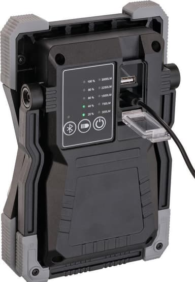 Den mobila LED-uppladdningsbara spotlighten RUFUS 3010 MA med Bluetooth-högtalare från Brennenstuhl är en extremt robust LED-arbetslampa med 30W effekt som uppfyller de högsta kraven. Med ett hölje av kompakt pressgjuten aluminium och extra kantskydd av högkvalitativ plast är den lämplig för både inomhus- och utomhusbruk. Dessutom har den en integrerad Bluetooth-högtalare så att du kan streama din musik från telefonen utan problem.