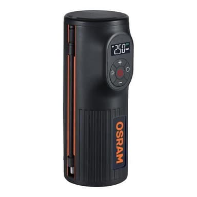 OSRAM TYREinflate 2000 är en uppladdningsbar däckpump med digital bakgrundsbelyst display för enklare och mer exakta tryckmätningar och uppblåsning av däck som visar tryckvärden i BAR, kPA och PSI.