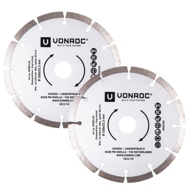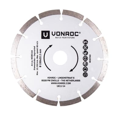 Dessa segmenterade VONROC diamantskivor kan användas för skärning i betong, kakel, keramik eller takpannor. Skivorna har en diameter på 150mm.