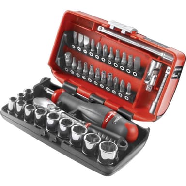 Facom Hylsnyckelsats metrisk 1/4 38 delar RL.NANO1Spärrnyckel: rotationsvinkel 5 °. Utförande: satinerad, förkromad.Spärrnyckel, 72 tänder för 5° rotationsvinkel · Hylsnyckel, sexkantig, SW 5,5 - 14 mm, 2 förlängningar · Bitsats 21-delars. +Läs mer om produkten
