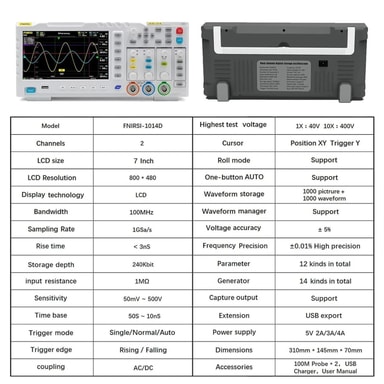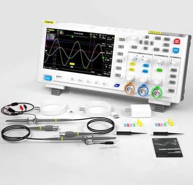 Detta oscilloskop från FNIRSI är ett kraftfullt verktyg för både hobbyister och professionella användare inom elektronik. Med dubbel kanal, 100MHz*2 analog bandbredd och en realtids-samlingshastighet på 1GSa/s kan du mäta och analysera signaler med hög precision. Tack vare den inbyggda DDS signalgeneratorn och omfattande lagringsmöjligheter fungerar enheten både som analysator och generator i ett kompakt och bärbart format.