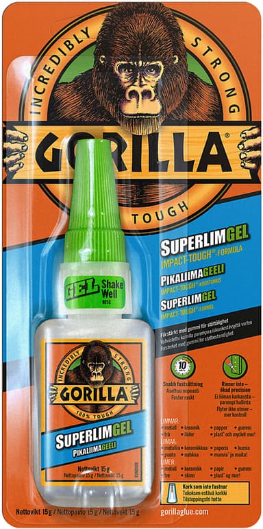 Gorilla Super Glue är superlimmet som verkligen håller och som torkar på bara 10 sekunder. Limmet har små gummipartiklar i sig vilket innebär ännu lägre risk för att limmet lossnar under påverkan och därmed gör dina reparationer mer hållbara. Vi kallLäs mer om produkten