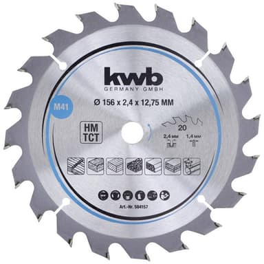 kwb 584157 Hårdmetall cirkelsågklinga 156 x 12.75 mm 1 stSågblad med en bladdiameter på 156 mm, borrdiameter på 12, 7 mm, stam-tjocklek 1, 4 mm och en skärbredd på 2, 4 mm.,spånskivor-sågbladet utmärker sig genom ett medeltal av tänder: Så kalladLäs mer om produkten