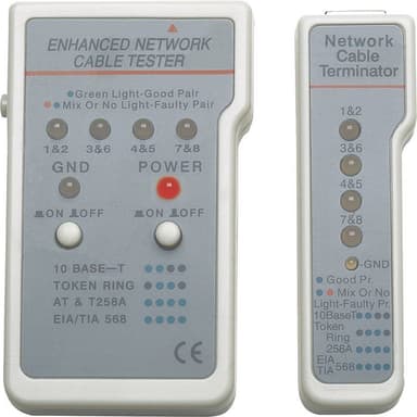 Nätverkstestare Passar till: CAT 3, CAT 4, CAT 5, CAT 5e, CAT 6, CAT 6A Intellinet 351898Vikt: 0,185 kg Färg: beige och grå Batteri: 9V DC eller alkaliska LED:er: - Power - Ground - Pair 1 & 2 - Pair 3 och 4 - Pair 5&6 - Pair 7&8Kabeltyper:Läs mer om produkten
