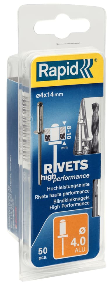 High Performance-aluminiumnitar. Storlek: Ø4,0 x 14 mm. Antal: 50 st. Inkl. borr Till: RP10 , RP40, RP60, RP100 Användningsområde: registreringsskyltar, stänkskärmar, metall- och plastöverdrag, namnskyltar mmLäs mer om produkten