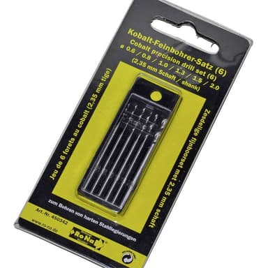 RONA 812167 HSS Metall-spiralborrset 6 delar 0.6 mm, 0.8 mm, 1 mm, 1.3 mm, 1.5 mm, 2 mm Cobalt DIN 338 Cylinderskaft 1Kobolt - legerad borr för hårda stållegeringar och snabbare skärhastighet genom krysspår · 10 x längre livstid · Skaft-Ø motsvararLäs mer om produkten