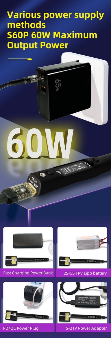 Sequre S60P är en liten men kraftfull lödkolv. Kräver 12-21V (2-5S) ingång, och kabel för anslutning av batteri med XT60-kontakt ingår. 0 FPV-batterier. Lödkolven justeras digitalt via displayen.Läs mer om produkten
