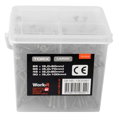 TORX spånplatteskruvar i praktisk box, som innehåller: 65 st. - 5,0 x 60 mm 55 st. - 5,0 x 70 mm 45 st. - 5,0 x 80 mm 30 st. - 5,0 x 100 mm CE-godkändLäs mer om produkten