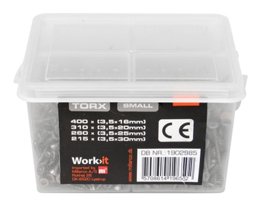 TORX försänkt träskruv i praktisk box, som innehåller: 400 st. - 3,5 x 16 mm 310 st. - 3,5 x 20 mm 260 st. - 3,5 x 25 mm 215 st. - 3,5 x 30 mm CE-godkändLäs mer om produkten