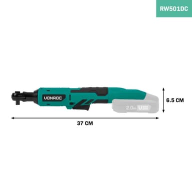 På VONROC stävar vi alltid efter maximal bekvämlighet. Vi har därför utrustat den batteridrivna spärrnyckeln med en LED-arbetslampa så att även de mörkaste hörnen är väl upplysta. Med riktningsomkopplaren ändrar du enkelt roterationsriktning. 3/8"-chucken innehåller ett stift för att säkra hylsorna.