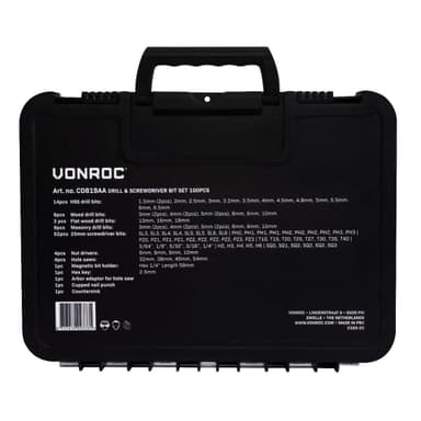 Det här kompletta setet från VONROV innehåller borrar, bits, hålsågar och mycket mer! Från och med nu har du rätt bits eller borr för varje typ av arbete. Setet levereras i en praktiskt förvaringsfodral så att du alltid har rätt tillbehör inom räckhåll. Tack bara det praktiska förvaringsfodralet kan du förvara bitsen och borrarna snyggt och enkelt.