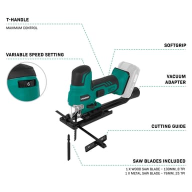 Vi har packat denna sticksåg med funktioner som gör ditt arbete enklare och mer komfortabelt. Tack vare snabbfästet byter du blad snabbt och verktygsfritt. Den medföljande parallellanslaget hjälper dig att såga längs kanter och skapa flera remsor med samma bredd. Inbyggd LED-belysning håller såglinjen tydlig även i svagt ljus. Och med både blås-funktion och universaladapter för dammsugare hålls arbetsytan ren och fri från spån.