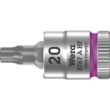 Wera 8767 A 05003364001 Inner-sextandhålsgrepp (TX) Hylsnyckel-bitsinsats T 20 1/4Hållfunktion för skruvar · Färgkodning · Ränder på den bakre änden för hög greppsäkerhet.Läs mer om produkten