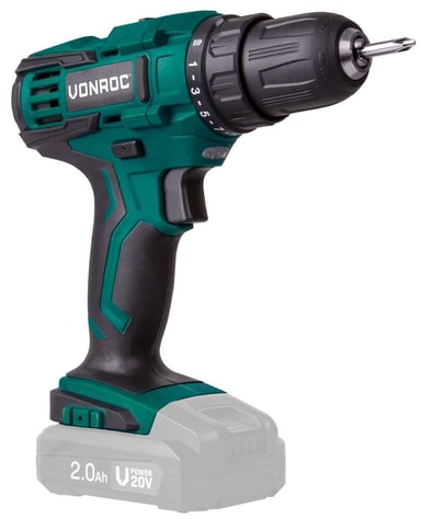 Denna borr och skruvdragare levereras utan batteri eller laddare. Detta för att maskinen ingår i VONROCs VPower 20V Plattform, en batteri plattform för flera VONROC maskiner och verktyg.