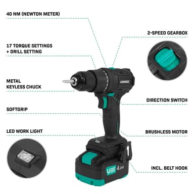 I väskan finns även ett 4.0Ah batteri och en laddare, båda delar av VONROC VPower 20V batteriplattform. Det betyder att de är kompatibla med alla andra verktyg i denna batteriplattform. Med detta set har du inte bara allt du behöver för borrskruvdragaren, utan också kraften för att driva alla andra verktyg från VONROC 20V plattform. Kort sagt, ett fantastiskt komplett set som låter dig komma igång direkt!