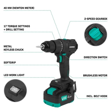 Denna borrskruvdragare levereras med ett 4.0Ah batteri och laddare som ingår i VONROC:s batteriplattform. Du kan även köpa till extra 2.0Ah eller 4.0Ah batterier separat. Vill du kombinera borrskruvdragaren med andra produkter från VONROC:s batteriplattform? Då räcker det med ett batteri och en snabbladdare! Välj bara det du behöver – till ett konkurrenskraftigt pris.