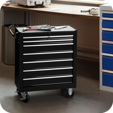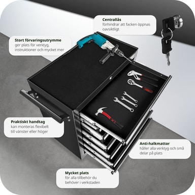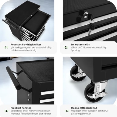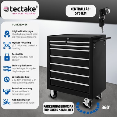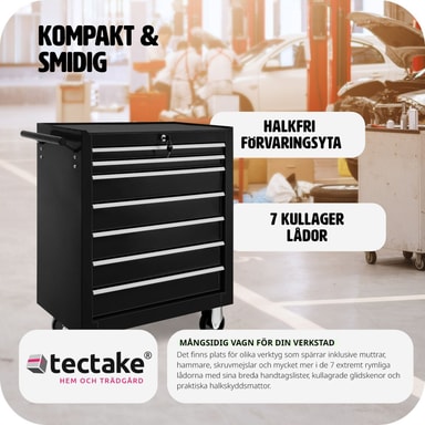 Med tectakes verktygsvagn får du optimal verktygsförvaring - alla verktyg hittar sin plats och du hittar dem! Denna Verktygsvagn har sju stora och dessutom låsbara, kullagrade lådor. Oavsett om du har detta verktygsskåp på hjul i hobby- eller proffsverkstaden, kommer du att tjäna på verktygsförvaringen. Verktygsvagens lådor har lås, som både förhindrar att lådorna åker ut vid förflyttning och skyddar mot obefogad tillgång. Dessutom har den pulvermålade verktygsvagnen halksäkra mattor i lådorna och på hyllplanet. Fyra stabila hjul förenklar förflyttningen av denna verkstadsvagn och möjliggör mobil användning. Köp hem din verktygsvagn redan idag, vagnen kommer att vara en trogen tjänare under många år.