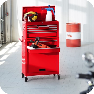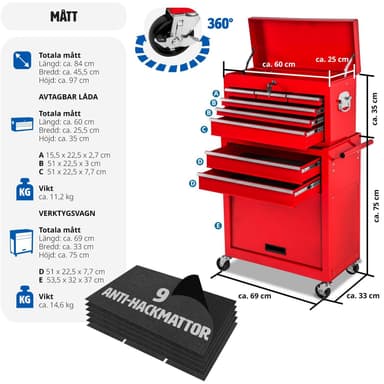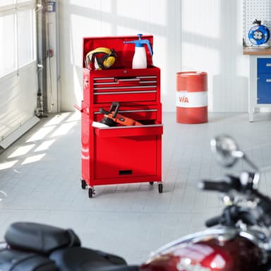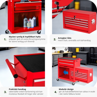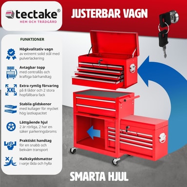 Denna verktygsvagn övertygar med det lilla extra - det löstagbara, fastsättningsbara och mobila överskåpet är raffinerat och praktiskt och fungerar bra som verktygslåda! Med denna verktygsvagn med överskåp har du allting nära till hands när du behöveLäs mer om produkten