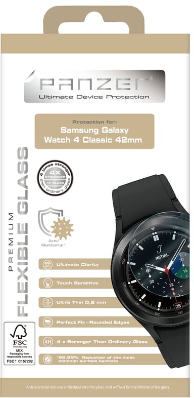 Skydda din klocka från stötar och repor med Panzer Samsung Galaxy Watch4 Classic 42 mm flexibelt skärmskydd i glasLäs mer om produkten