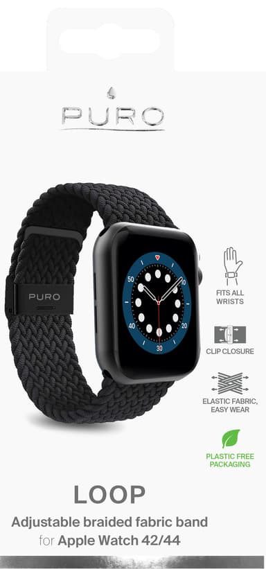Puro Apple Watch 42-45mm Loop klockarmband är gjord av töjbart flätat nylonmaterial som är superbekvämt och är utmärkt för att bäras hela dagen. Den har en one-size-design och är vatten/svettålig.Läs mer om produkten