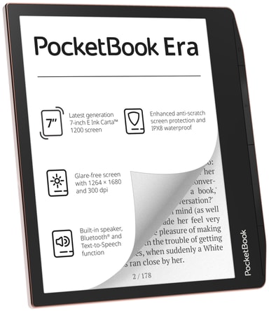 Läs alla dina favorittitlar på den eleganta och funktionsspäckade PocketBook Era eBook 64GB, med en 7-tums E-ink Carta 1200 HD+-skärm, inbyggd högtalare och Bluetooth-anslutning för text-till-tal och upp till en månads batteritid.Läs mer om produkten