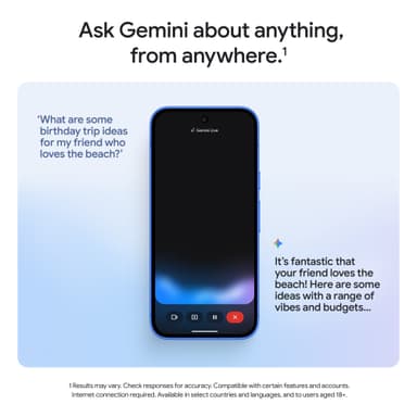 3. Batteritiden beror på många faktorer och användningen av vissa funktioner förkortar batteritiden. Den faktiska batteritiden kan vara kortare. Med tiden hanterar mjukvaran i Pixel batteritid för att upprätthålla batterihälsan när batteriet åldras. Läs mer på g.co/pixel/battery-tests och g.co/pixel/batteryhealth.