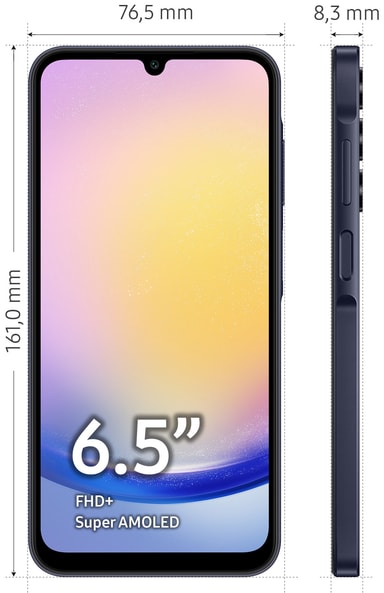 Samsung Galaxy A25 5G har en stor 6,5-tums FullHD+-skärm med smidig 120Hz uppdateringsfrekvens, en trippel kamerauppsättning med 50Mpx huvudkamera, en åttakärnig processor med 5G-stöd och ett 5000mAh batteri med 25W snabbladdning.Läs mer om produkten