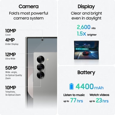 *Begränsat till Samsung smartphones. *Samsung Galaxy Z Fold6 har en topp ljusstyrka på 2600 nits på både Huvudskärmen och frontskärmen. Skärmarna är adaptiva och justerar ljusstyrkan automatiskt baserat på omgivningen. I områden med 5000 lux eller mer aktiveras Hög Ljusstyrka-läge och Vision Booster. *Jämfört med Samsung Galaxy Z Fold5 *Baserat på Samsungs interna labbtestvillkor med förhandsversion av given modell ansluten till hörlurar via Bluetooth under standardinställningar över LTE. Beräknad mot batterikapacitet och uppmätt ström över batteriförbrukning under videouppspelning (videofilupplösning 720p, sparad på enhet) och ljuduppspelning (mp3-fil, 192kbps, sparad på enhet med LCD-display avstängd), respektive. Faktisk video- och ljuduppspelningstid varierar beroende på nätverksanslutning, inställningar, filformat, skärmens ljusstyrka, batteriets skick och många andra faktorer.